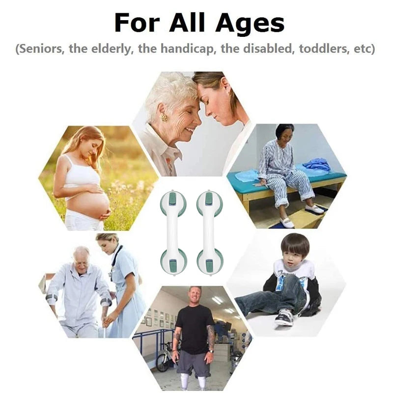ăNon-Slip GripăTwo strong suction cup design works on any bigger than 4" non-porous, flat surface, including tile, glass, acrylic and fiberglass. Perfect for senior, elderly, handicap and toddlers. The grab bar provides additional stability when entering and exiting the tub or shower for a safe and comfortable experience. Great for shaving legs, surgery recovery and preventing an injury.